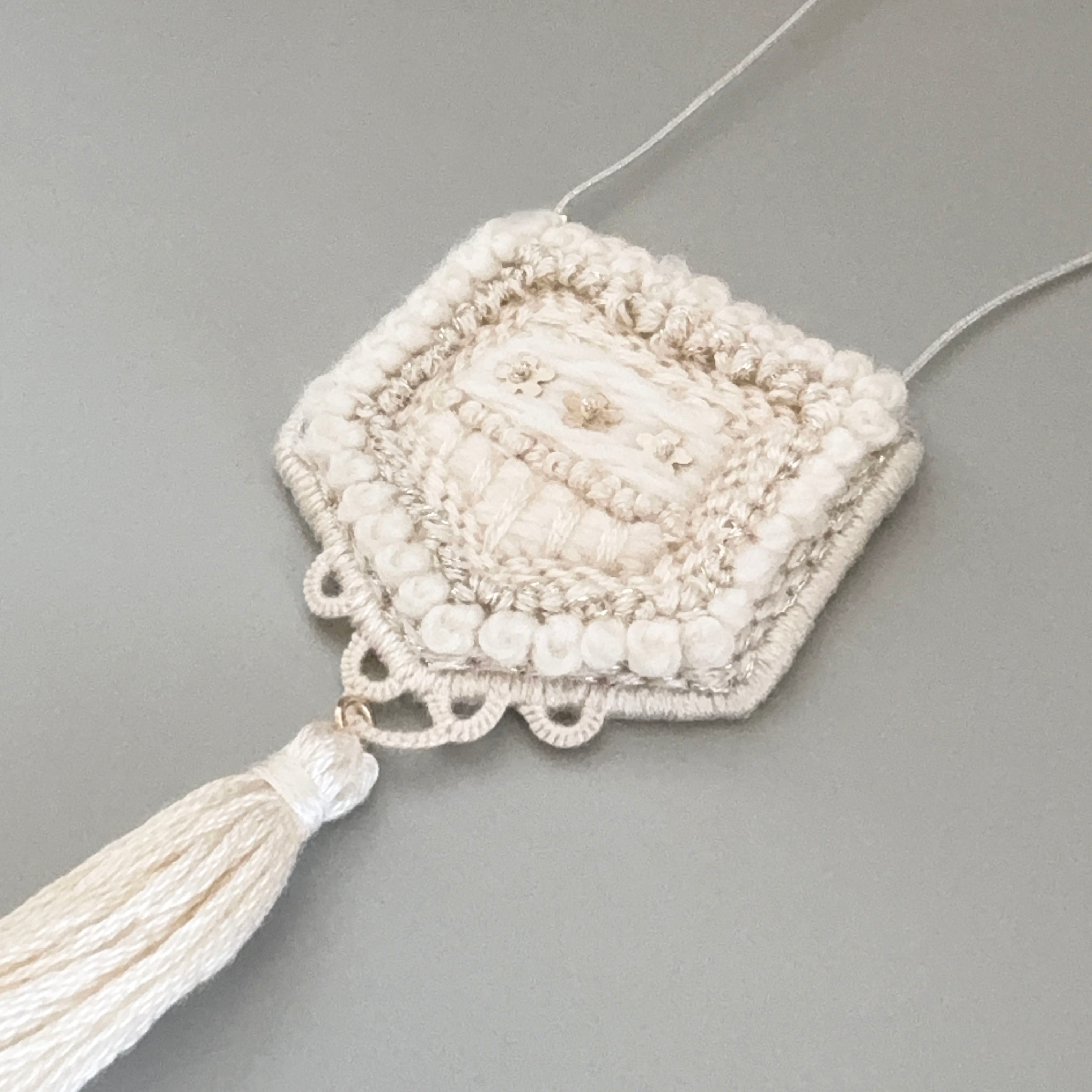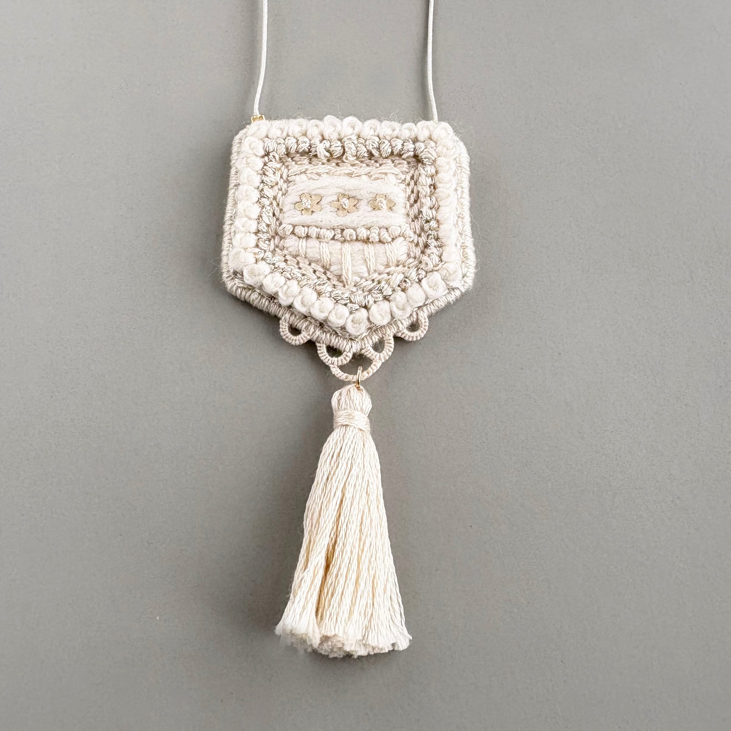 中央の繊細な刺繍と、やわらかなタッセルの揺れ。