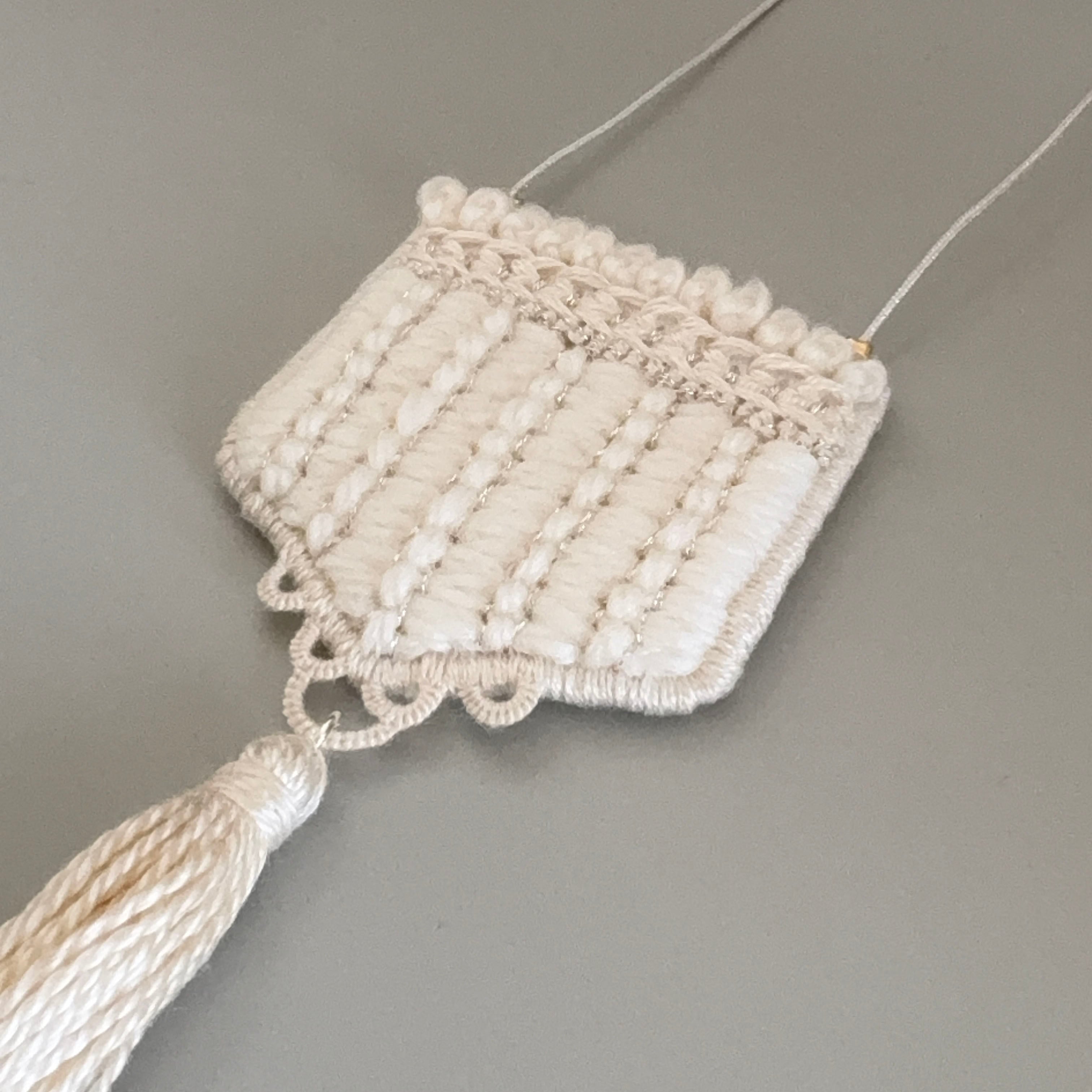 中央の繊細な刺繍と、やわらかなタッセルの揺れ。