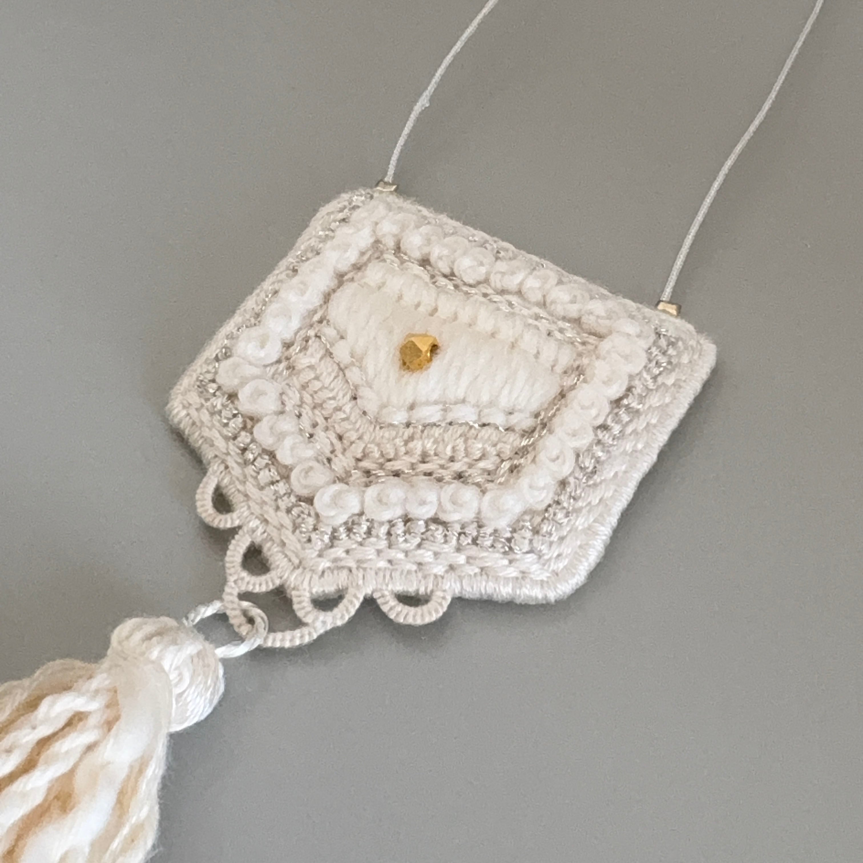 中央の繊細な刺繍と、やわらかなタッセルの揺れ。