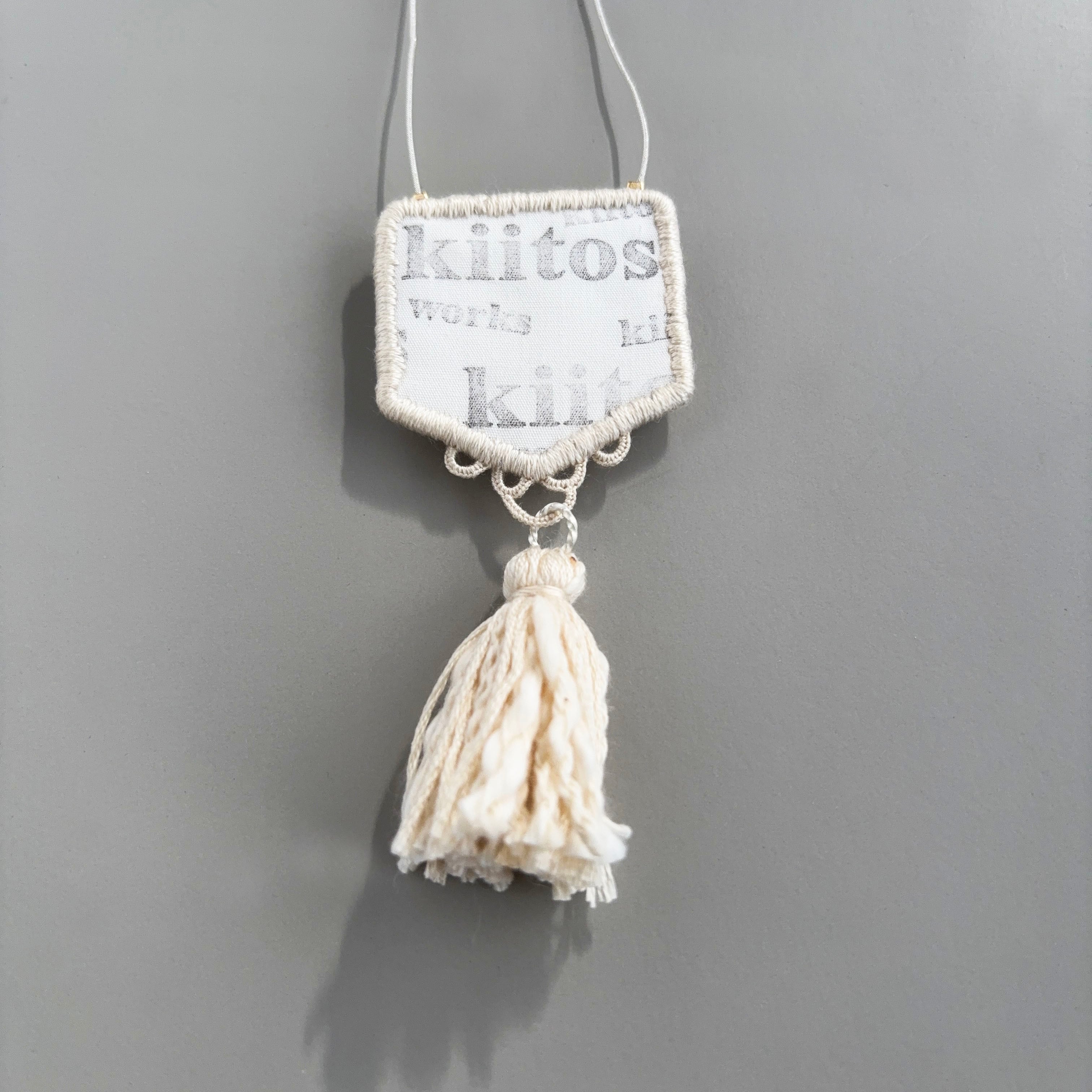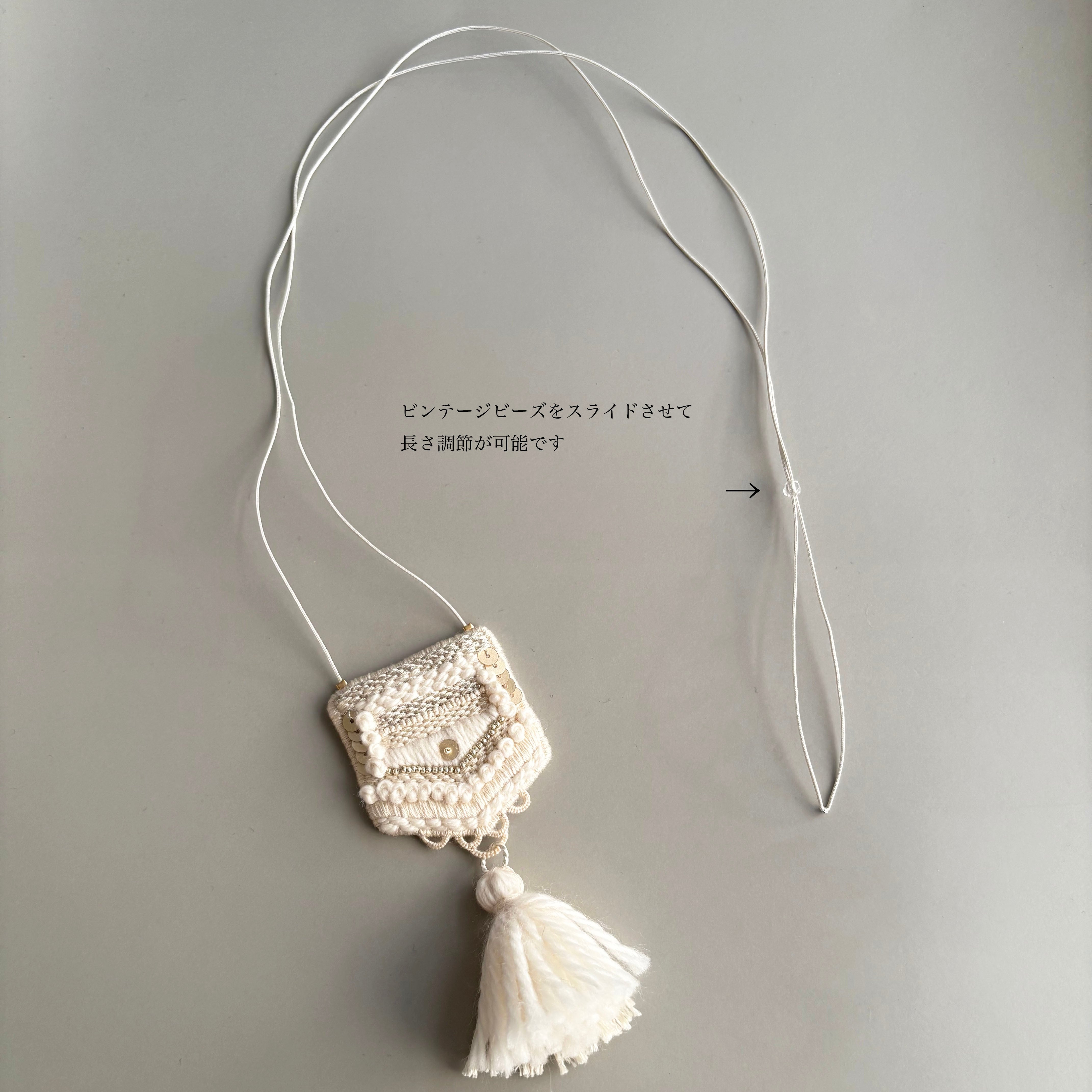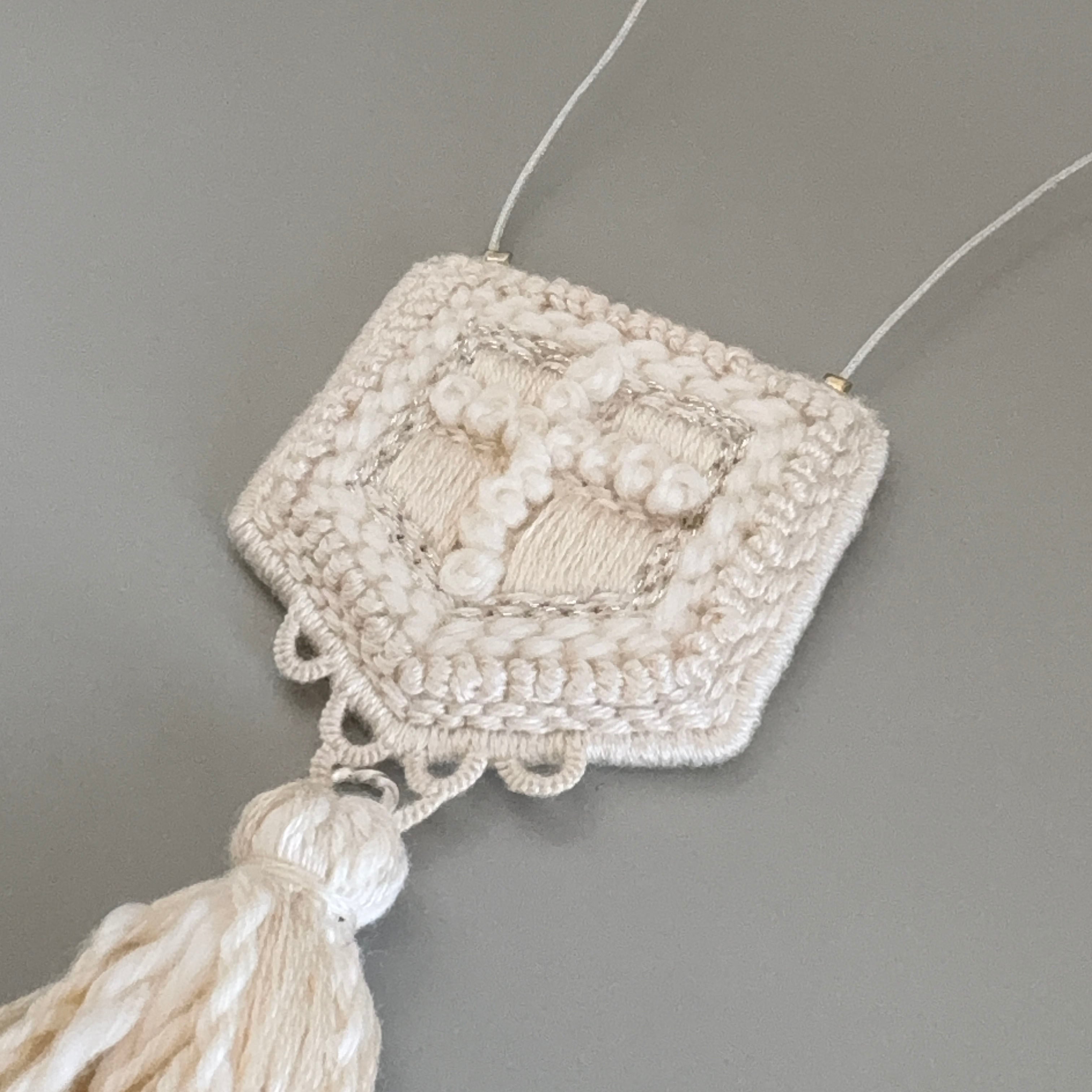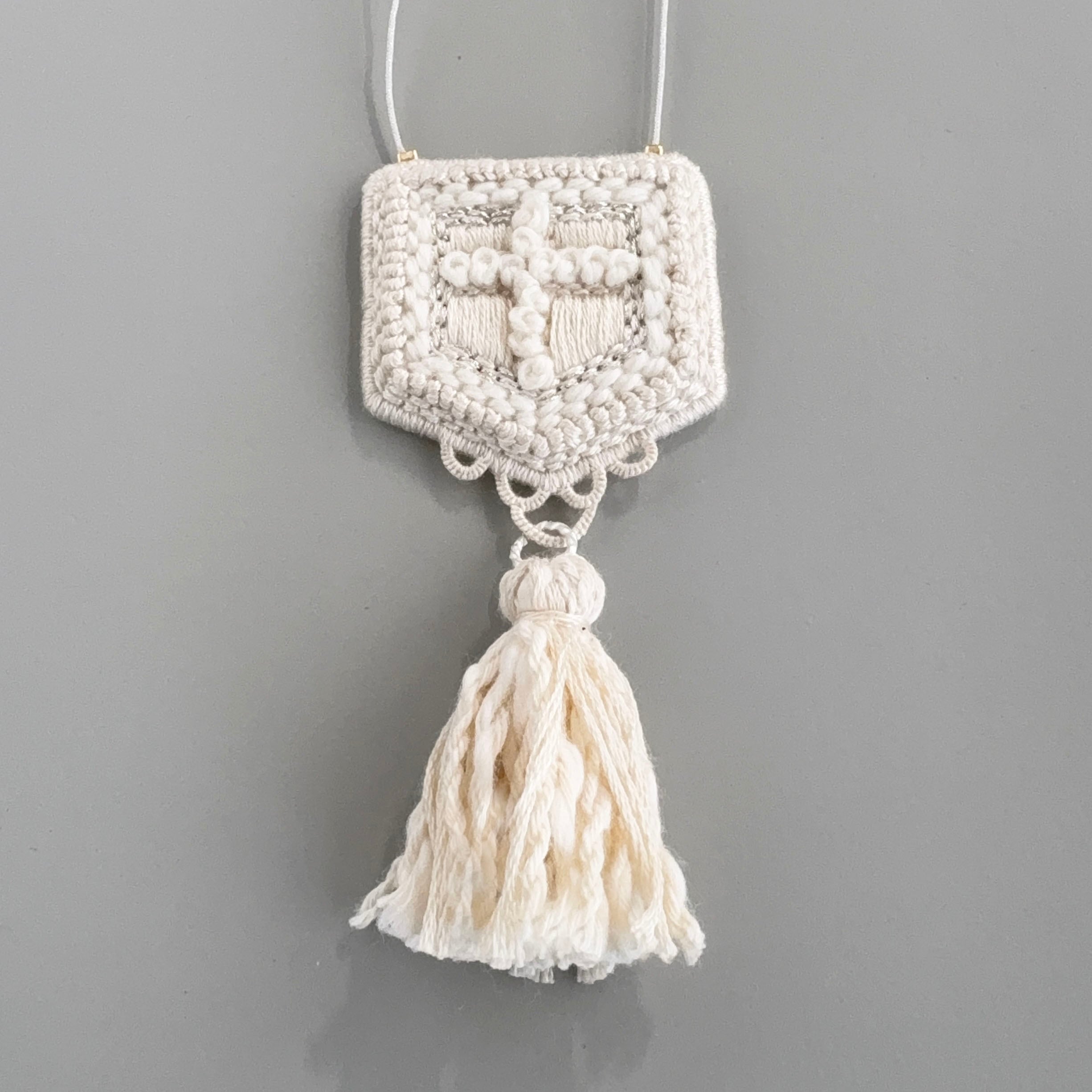 中央の繊細な刺繍と、やわらかなタッセルの揺れ。